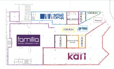 12 арендаторов, включая одежные дисконты Фамилия и Кари, книжный магазин "Читай-Город", магазин женского белья "Милавица", Pegas Туристик и пр.