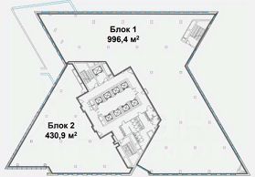 Описание помещения: Целиком этаж, поделен на два блока - 430,9 и 996,4 м2, общей площадью 1427,3 м2.