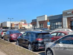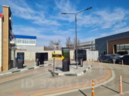 большой наземный паркинг перед зданием.