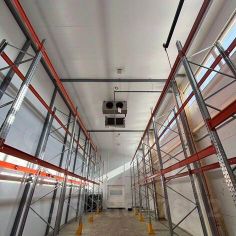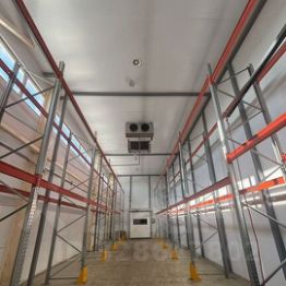 Металлоконструкция профильная труба 100*100*4, Сэндвич панель Pir 80мм. Трое скоростных ворот. Холодильное оборудование среднетемпературное ( 10-5) — два независимых агрегата на каждую часть камеры, производительностью 32 квт каждый.