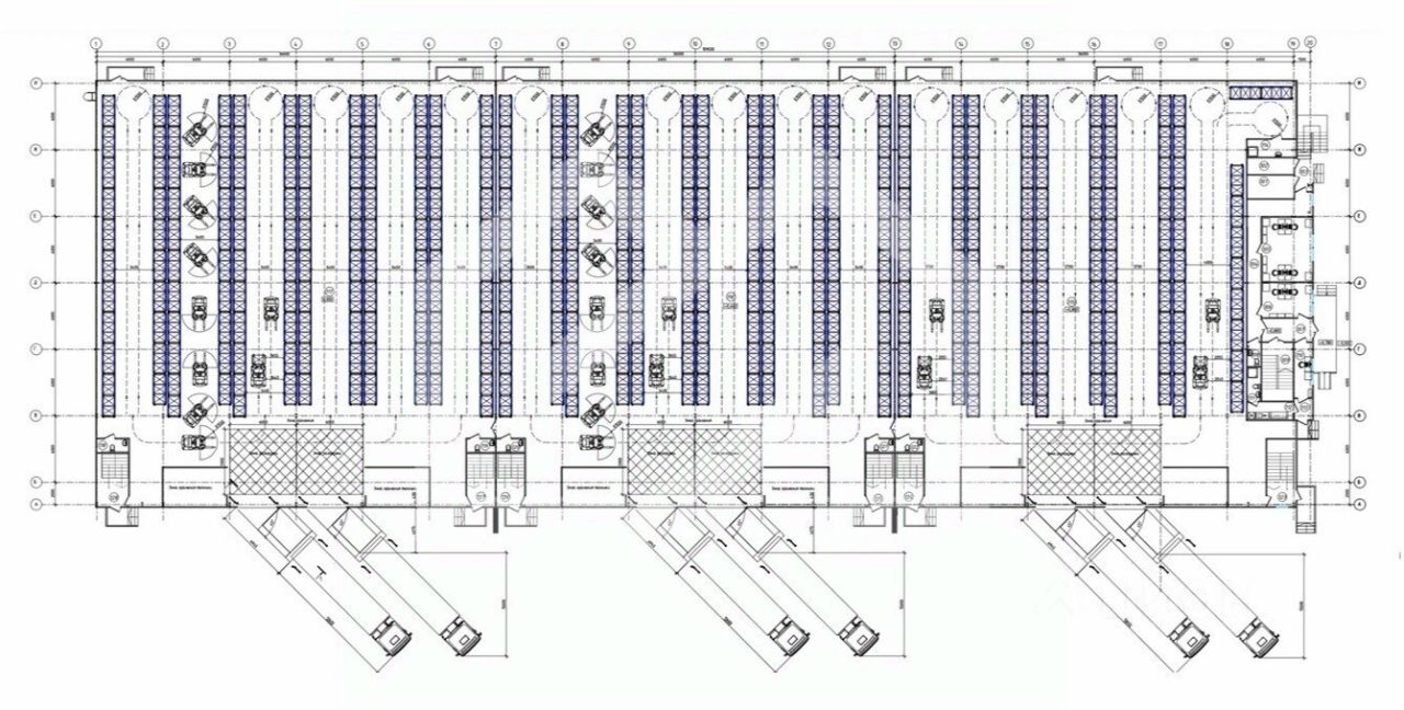 В каждом блоке - место для разгрузки крупнотоннажного транспорта - 2 дока на блок.