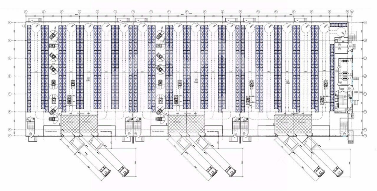 В каждом блоке - место для разгрузки крупнотоннажного транспорта - 2 дока на блок.