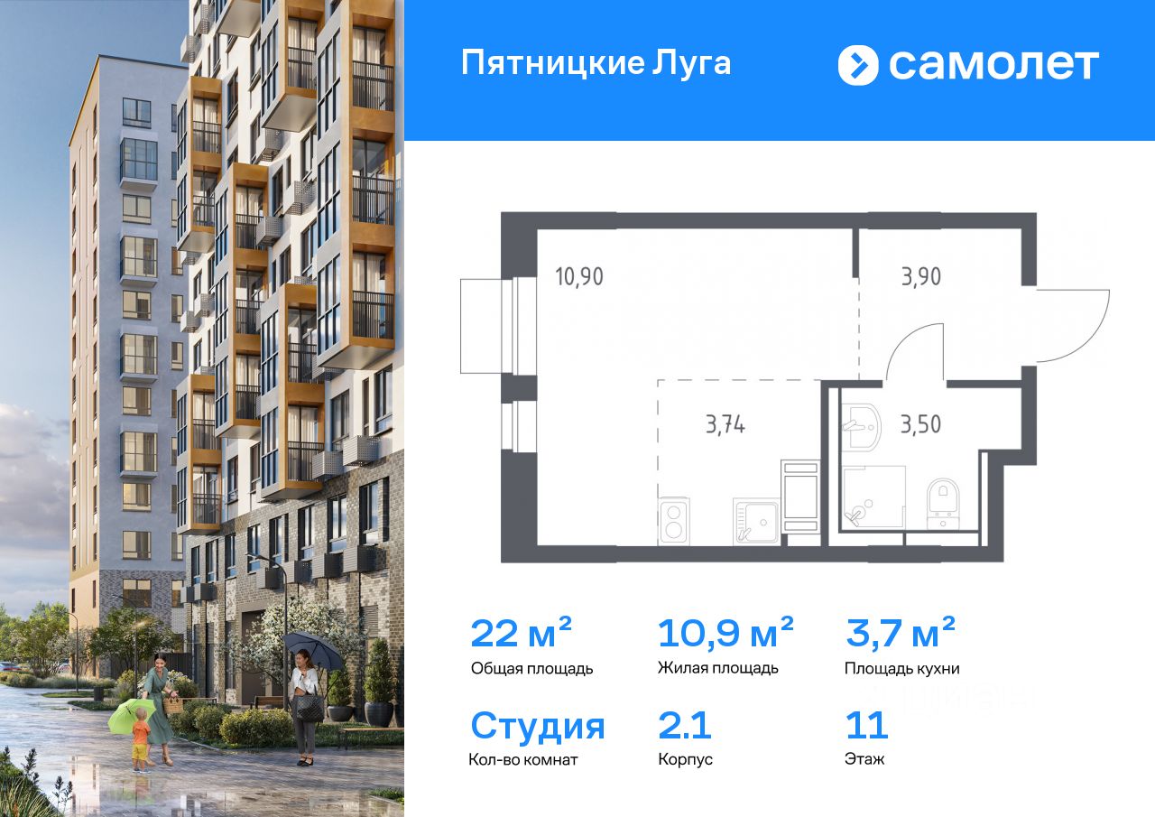 Строим кварталы для жизни с заботой о будущем. Предлагается квартира студия комфорт-класса 22,04 кв.м в корпусе 2.1 на 11 этаже, в ЖК "Пятницкие Луга"