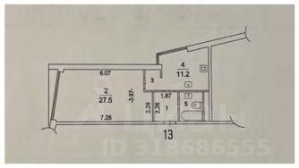 Комната- 27 кв м, кухня -11 кв м. Совмещенный санузел 4.5 кв м. коридор - 4.2 кв.м.