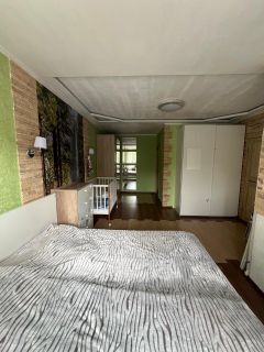 Этаж очень высокий, на уровне второго этажа. Окна выходят в сторону сада с яблонями в частном секторе. Вокруг много сосен, во двор забегают белки.