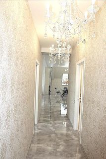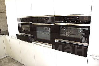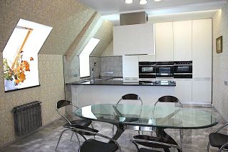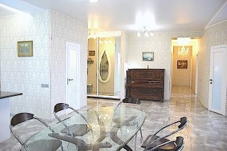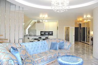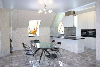 На первом этаже: Кухня столовая 80м.кв. объединенная с зоной отдыха. Кухня привозилась из италии, встроенная техника Kuppersbush (СВЧ, духовой шкаф, пароварка, посудомоечная машина, варочная панель), островная пофессиональная вытяжка итальянской фирмы MAX FIRE, холодильник Libher. Широкая столешница служит барным столом. Столешница и подоконники выполнены из натурального гранита. Три комнаты, две детские, одна с балконом и библиотека. Два сан узла, большой с отдельно стоящей ванной из литого мрамора и двумя итальянскими раковинами из фарфора. Есть гостевой с/у с душевой (установлен бойлер). На втором этаже расположена спальня. Отдельная гардеробная комната. В комнатах и коридоре очень вместительные встроенные шкафы. Вся мебель изготавливалась по индивидуальному заказу.