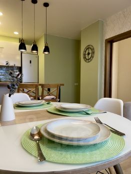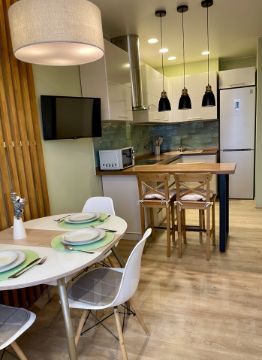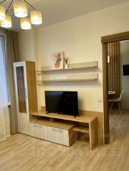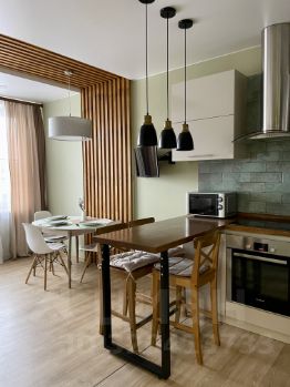 В квартире выполнен ремонт по индивидуальному дизайн-проекту. Использованы качественные материалы, дорогая техника, встроенная мебель на заказ! деревянная столешница на кухне перетекающая в барную стойку!