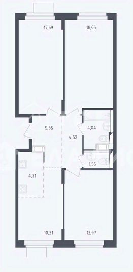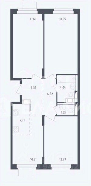 Общая площадь квартиры 80,85 метров, изолированные комнаты 18,5, 17,69 и 13,97 метров, кухня-гостиная 15,2 метров, то есть по факту это евро трешка. Два санузла.