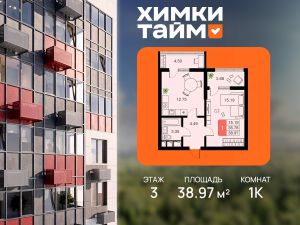 Продается однокомнатная квартира в жилом комплексе комфорт класса "Химки Тайм" площадью 38.97 кв.м на 3 этаже 20 этажного дома. Квартира с полной отделкой, окна выходят на улицу.