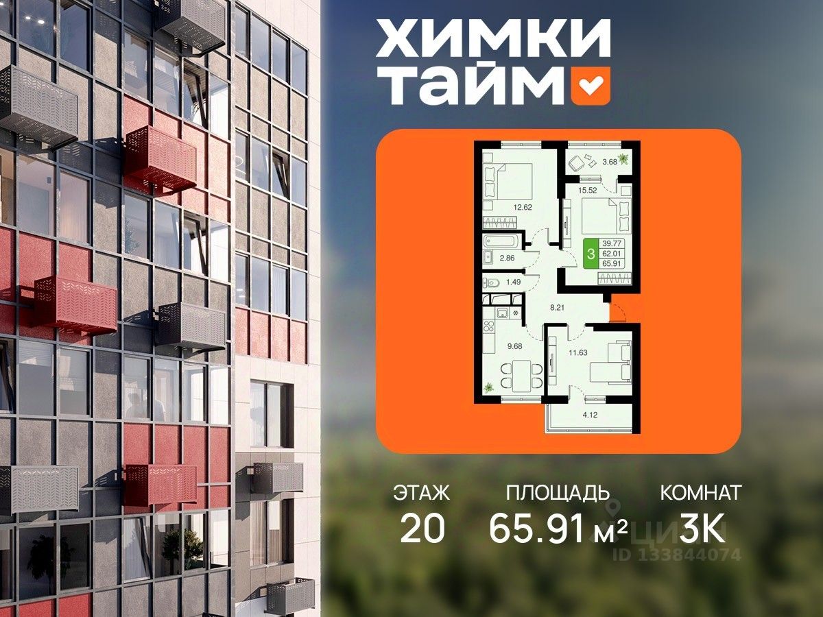 Продается трехкомнатная квартирав жилом комплексе комфорт класса "Химки Тайм" площадью 65.91 кв.м на 20 этаже 20 этажного дома. Квартира с полной отделкой, окна выходят во двор и на улицу.