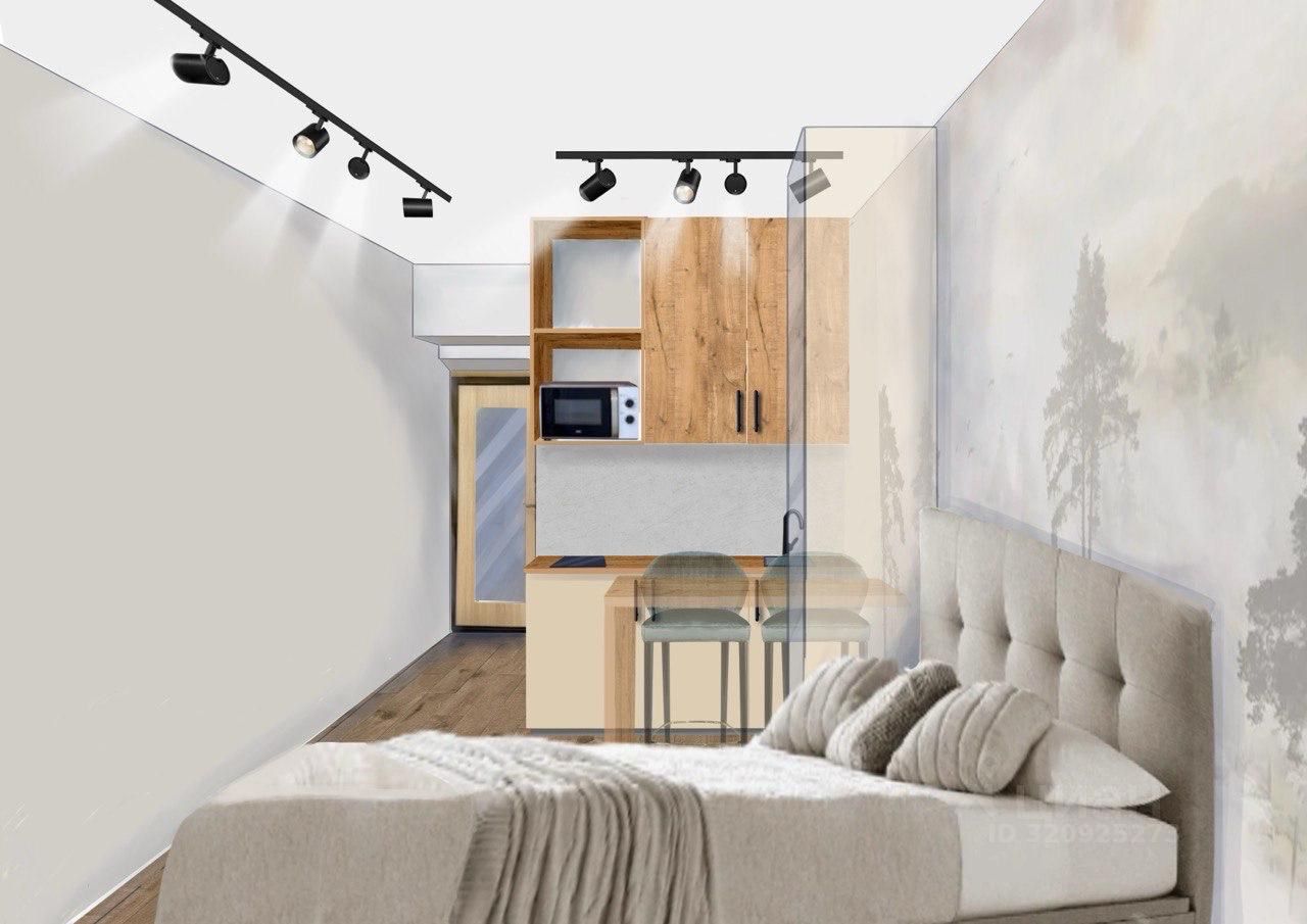 Требуется косметический ремонт. Планировка и рисунки - предложение дизайнера по переустройству в жилую студию с минимальными вложениями. Помещение использовалось как офисное. Все коммуникации подключены. Это апартамент, поэтому такая низкая цена относительно квартир в этом доме.