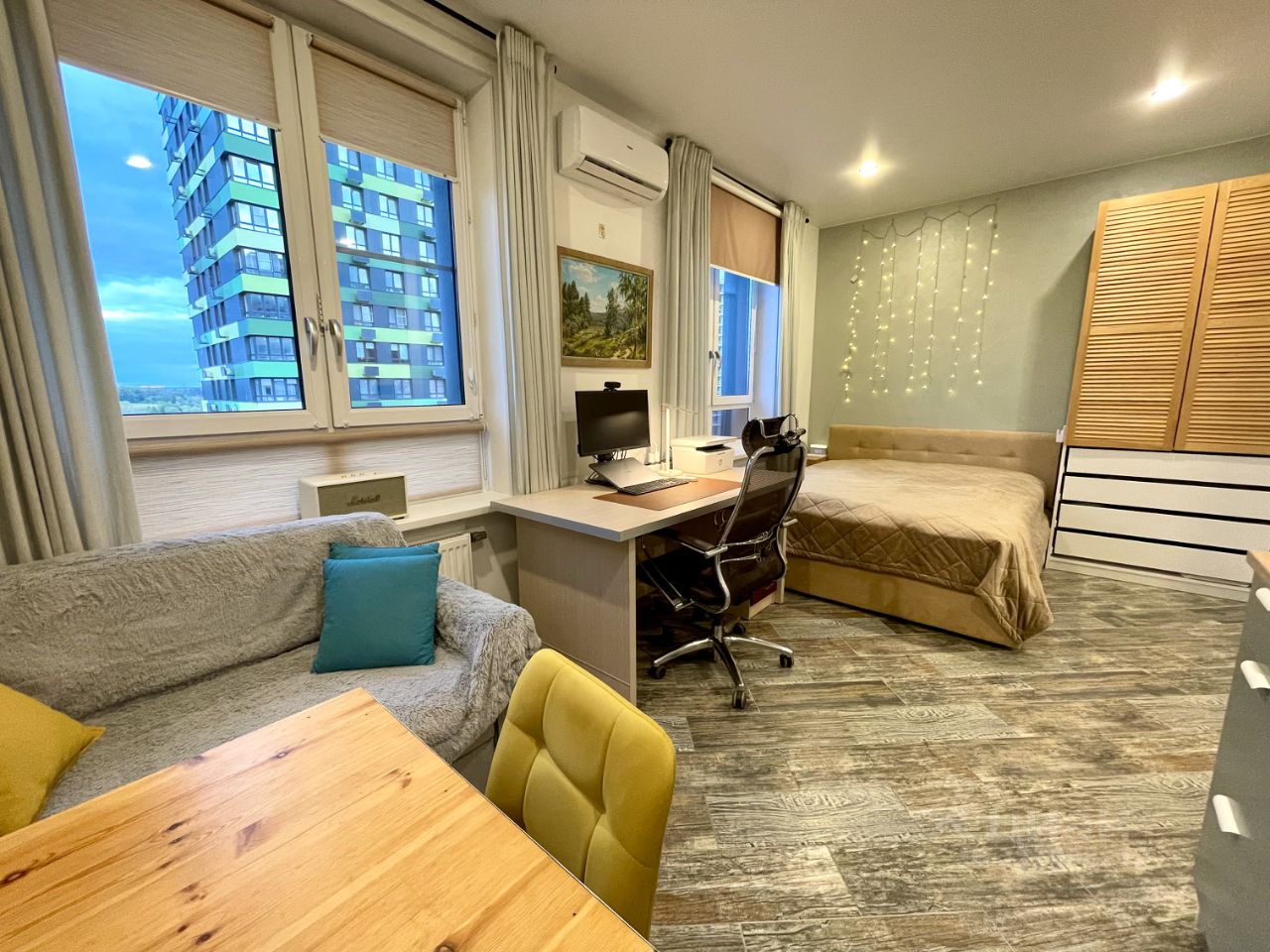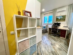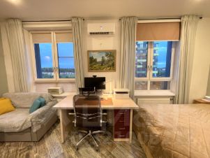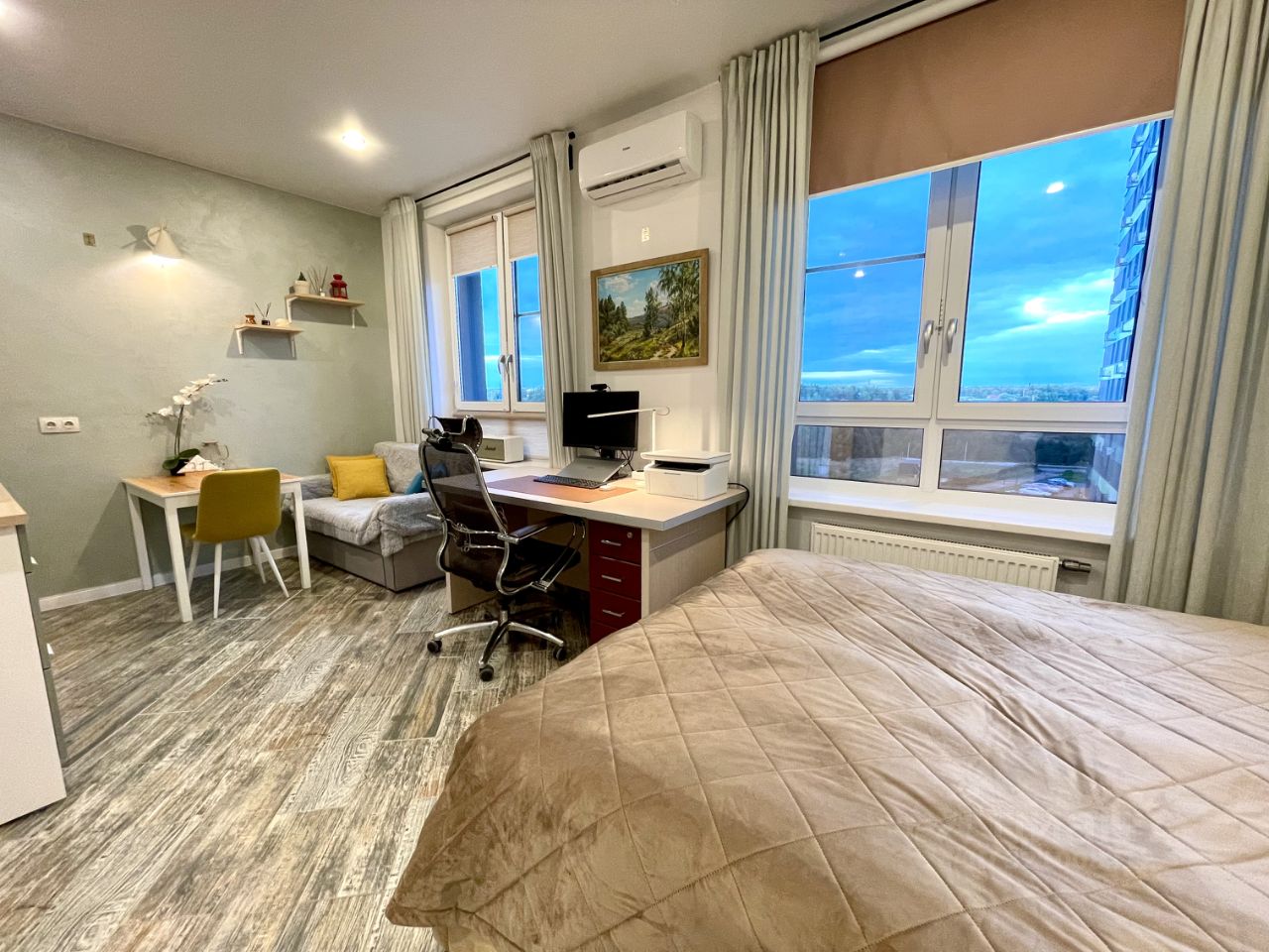 Удобная гардеробная зона с полками, большой с/у, и просторная кухня-гостиная с местом для рабочего стола и компьютера, раскладной диван, рулонные шторы по размерам на заказ со стороны кровати блэкаут, и со стороны кухни посветлее, Итальянские терморегуляторы на батареях отопления, кондиционер Haier работает как на тепло так и на холод.