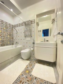 В квартире выполнен ремонт из натуральных дорогостоящих материалов. Керамогранит и плитка.
