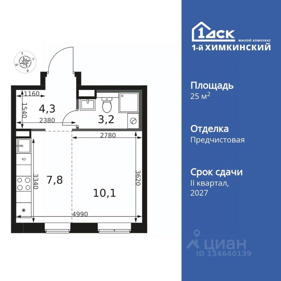 Продаётся квартира-студия номер 7 общей площадью 25.4 кв.м. на 2-м этаже 17 этажного здания. Отделка Whitebox.