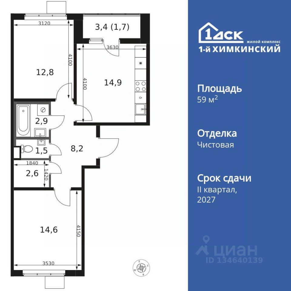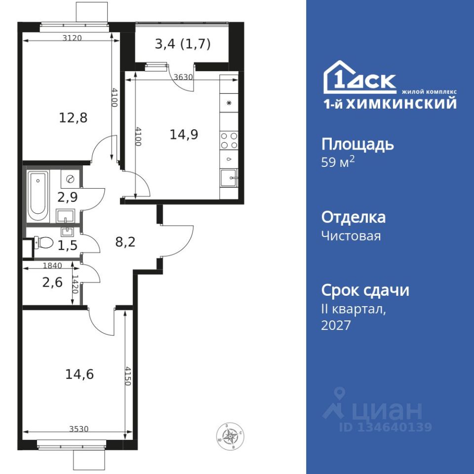 Продаётся 2-к квартира номер 273 общей площадью 59.2 кв.м. на 8-м этаже 14 этажного здания. Чистовая отделка.