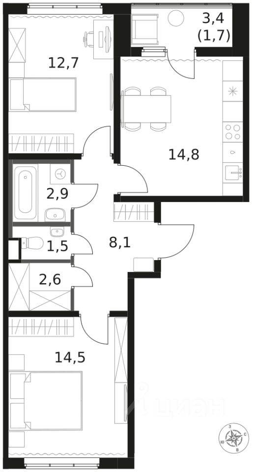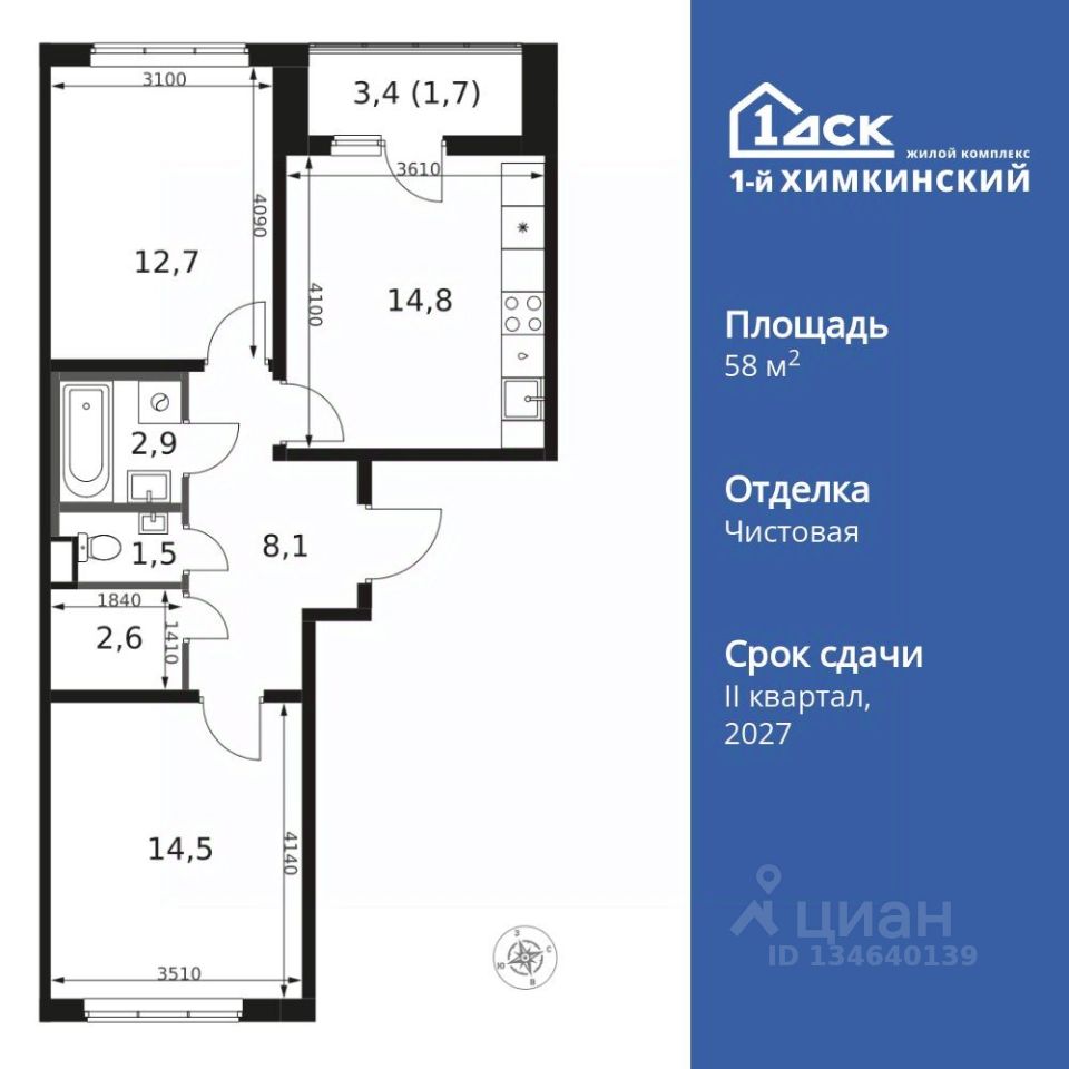 Продаётся 2-к квартира номер 231 общей площадью 58.8 кв.м. на 2-м этаже 14 этажного здания. Чистовая отделка.