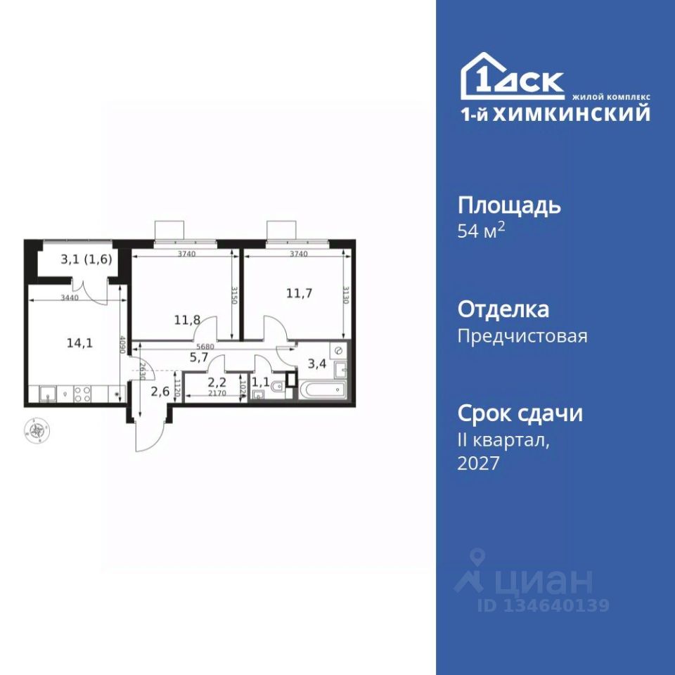 Продаётся 2-к квартира номер 397 общей площадью 54.2 кв.м. на 7-м этаже 12 этажного здания. Отделка Whitebox.