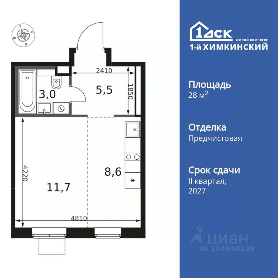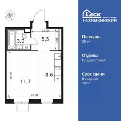 Продаётся квартира-студия номер 400 общей площадью 28.8 кв.м. на 8-м этаже 12 этажного дома. Отделка Whitebox.
