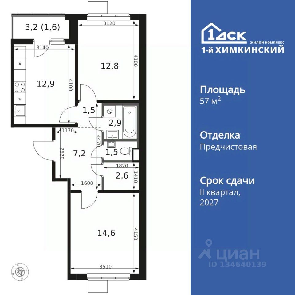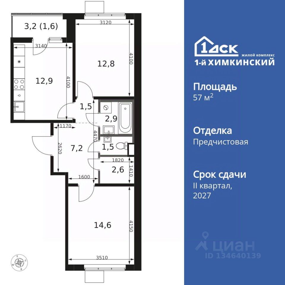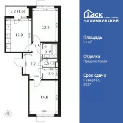 Продаётся 2-к квартира номер 468 общей площадью 57.6 кв.м. на 6-м этаже 14 этажного здания. Отделка Whitebox.