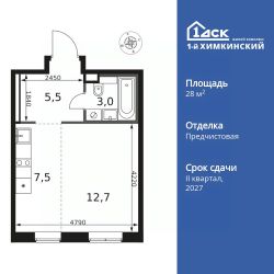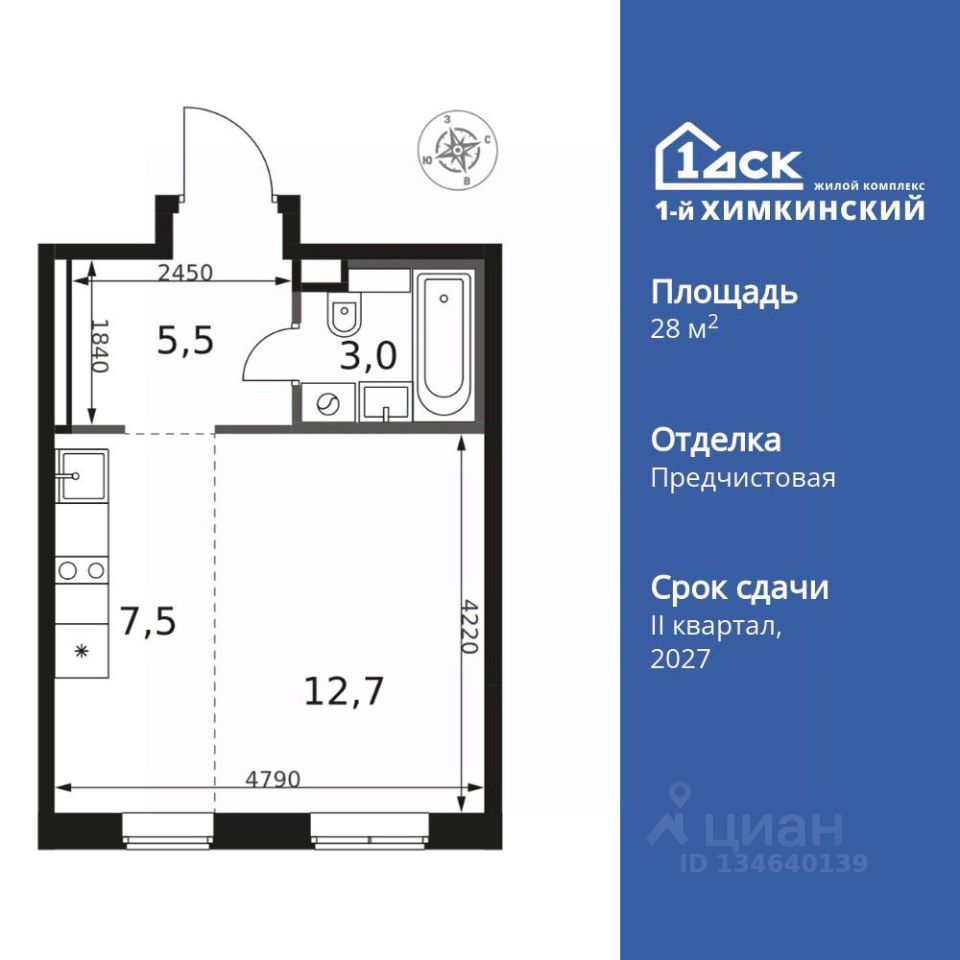 Продаётся квартира-студия номер 441 общей площадью 28.7 кв.м. на 2-м этаже 14 этажного здания. Отделка Whitebox.