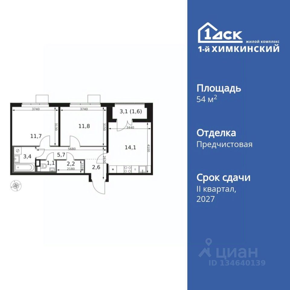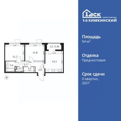 Продаётся 2-к квартира номер 451 общей площадью 54.2 кв.м. на 4-м этаже 14 этажного дома. Отделка Whitebox.