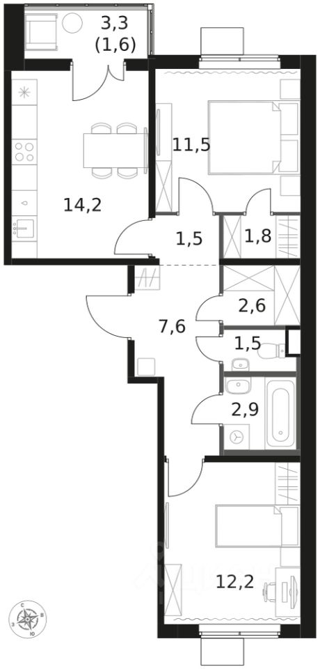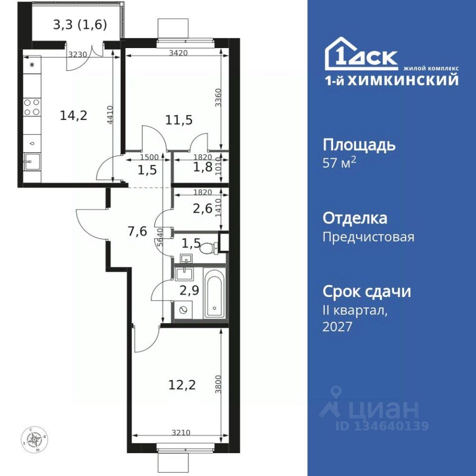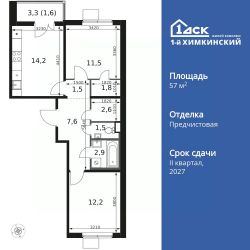 Продаётся 2-к квартира номер 694 общей площадью 57.4 кв.м. на 8-м этаже 8 этажного здания. Отделка Whitebox.