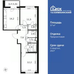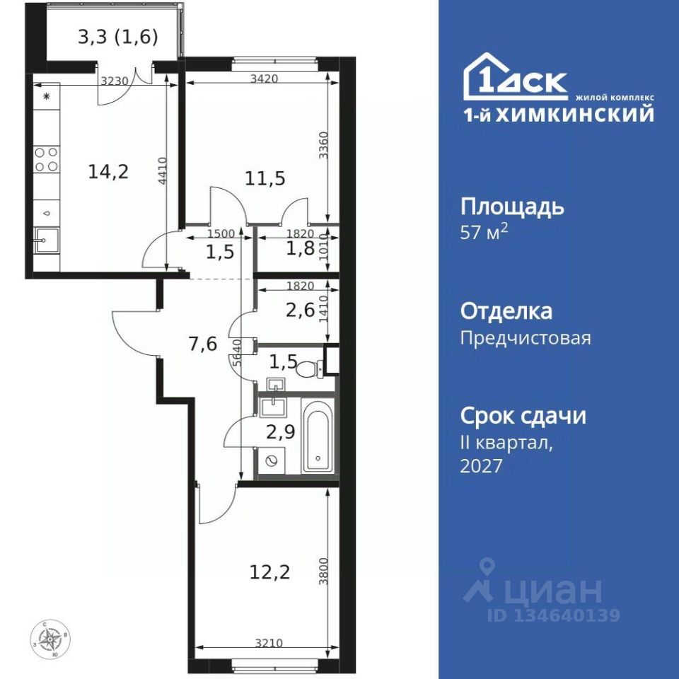 Продаётся 2-к квартира номер 670 общей площадью 57.4 кв.м. на 2-м этаже 8 этажного здания. Отделка Whitebox.