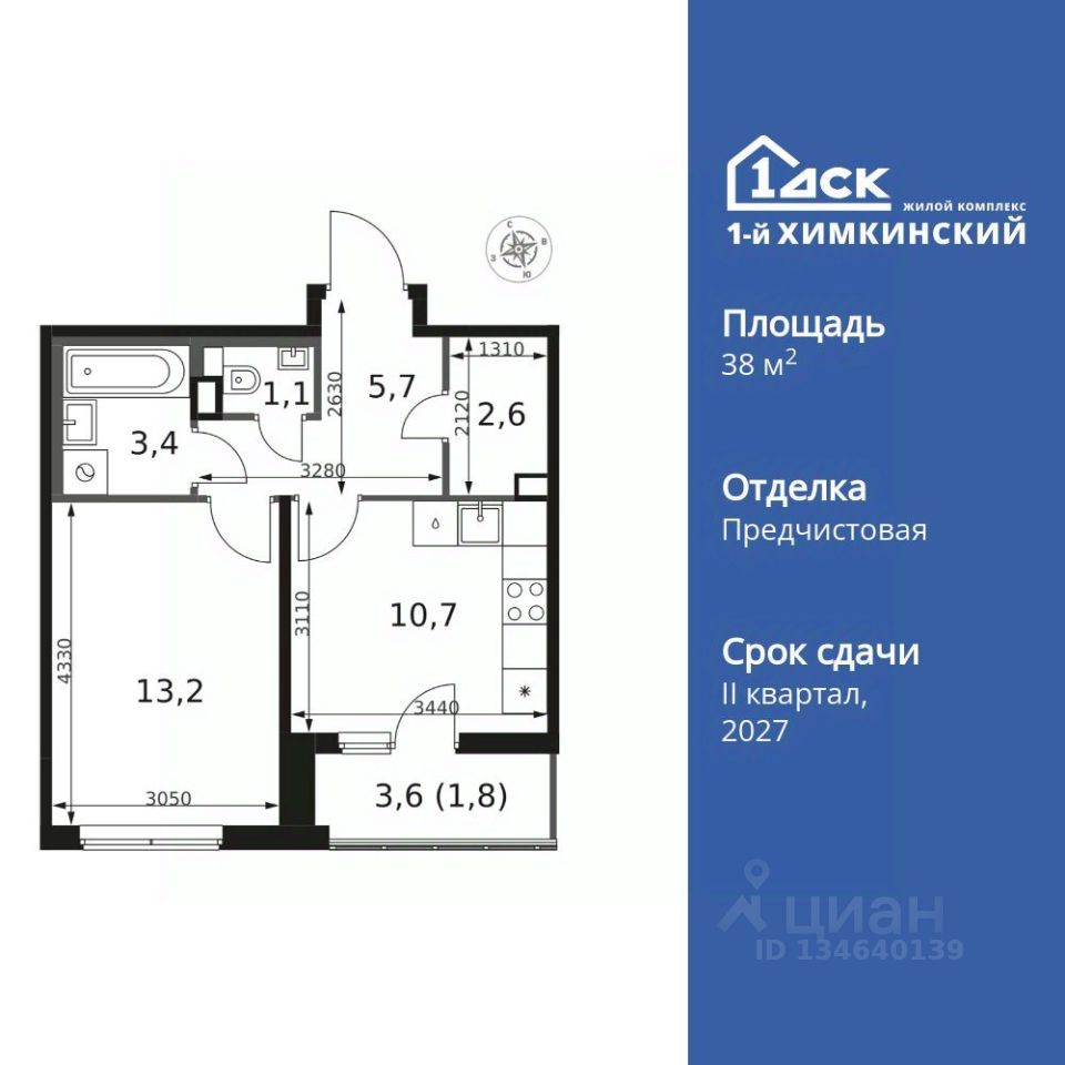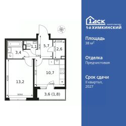 Продаётся 1-к квартира номер 672 общей площадью 38.5 кв.м. на 2-м этаже 8 этажного здания. Отделка Whitebox.