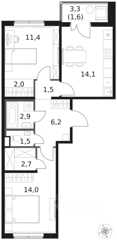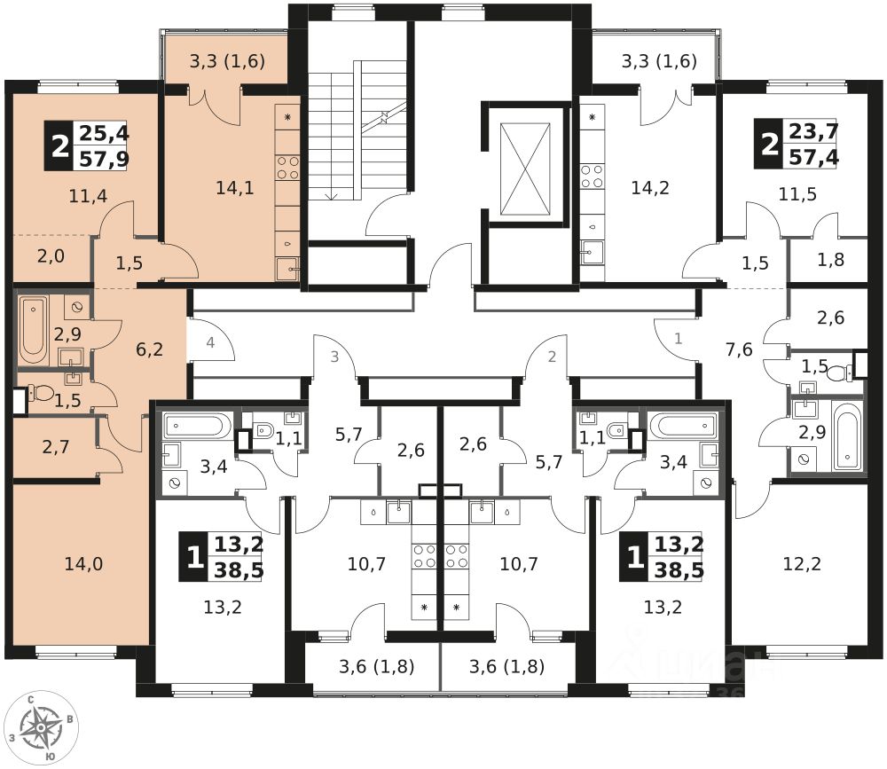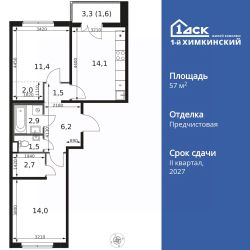 Продаётся 2-к квартира номер 673 общей площадью 57.9 кв.м. на 2-м этаже 8 этажного здания. Отделка Whitebox.