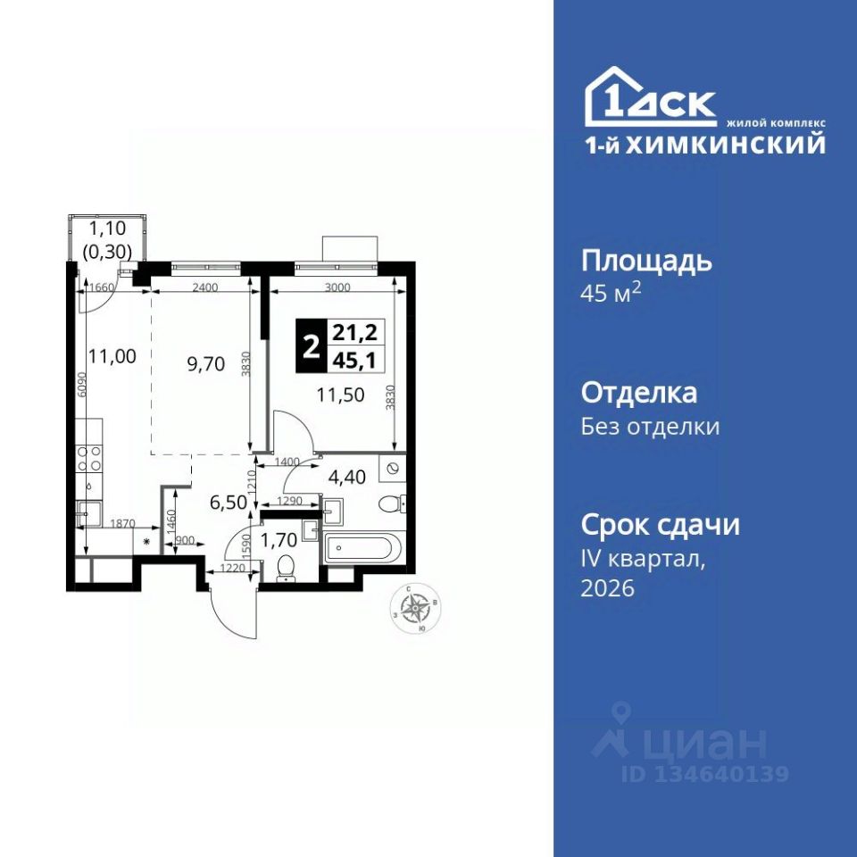 Продаётся 2-к квартира номер 154 общей площадью 45.1 кв.м. на 7-м этаже 7 этажного здания. Без отделки.