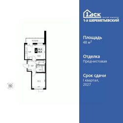 Продаётся 2-к квартира номер 93 общей площадью 48 кв.м. на 9-м этаже 16 этажного дома. Отделка Whitebox. Цена с учётом скидки!