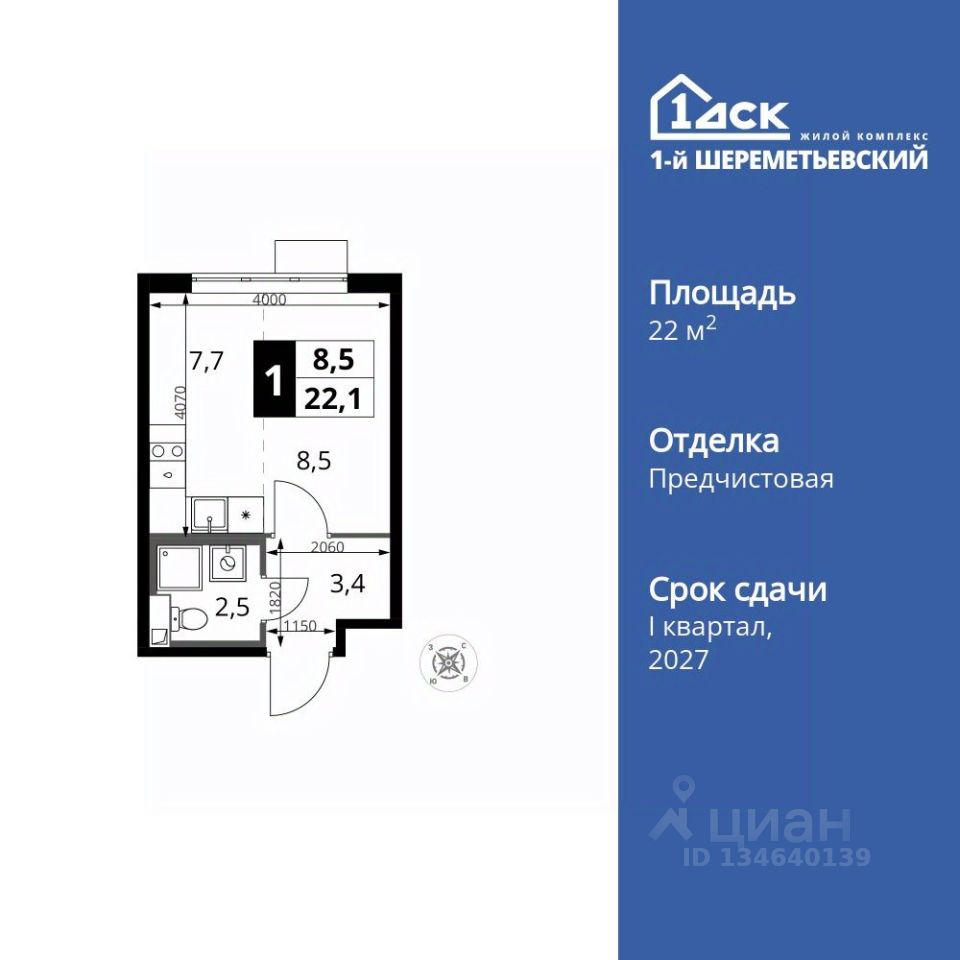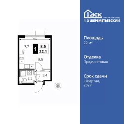 Продаётся квартира-студия номер 413 общей площадью 22.1 кв.м. на 9-м этаже 16 этажного здания. Отделка Whitebox.