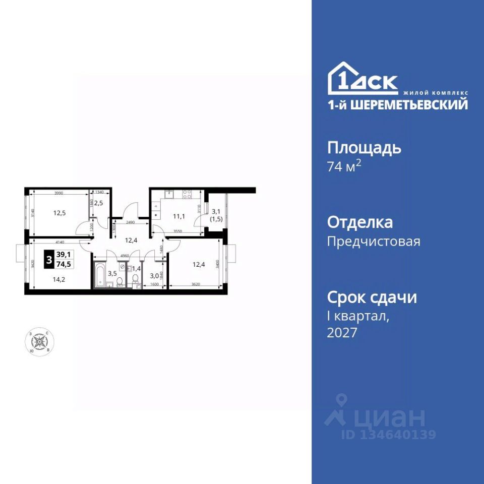 Продаётся 3-к квартира номер 459 общей площадью 74.5 кв.м. на 16-м этаже 16 этажного здания. Отделка Whitebox. Цена с учётом скидки.
