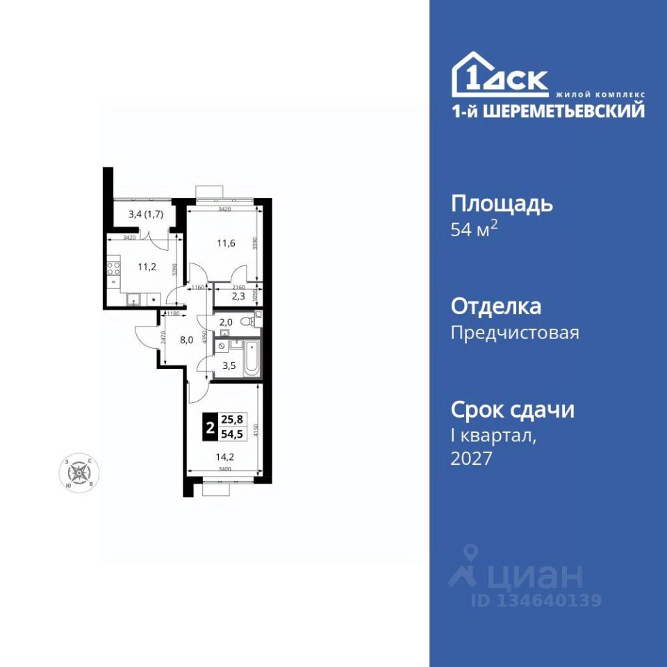 Продаётся 2-к квартира номер 582 общей площадью 54.5 кв.м. на 16-м этаже 16 этажного здания. Отделка Whitebox. Цена с учётом скидки.