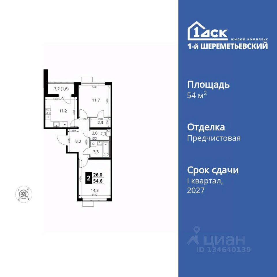 Продаётся 2-к квартира номер 630 общей площадью 54.6 кв.м. на 13-м этаже 16 этажного здания. Отделка Whitebox. Цена с учётом скидки.