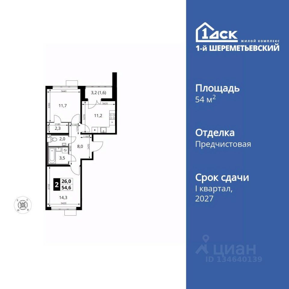 Продаётся 2-к квартира номер 677 общей площадью 54.6 кв.м. на 9-м этаже 16 этажного здания. Отделка Whitebox. Цена с учётом скидки.