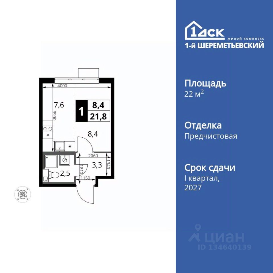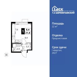 Продаётся квартира-студия номер 753 общей площадью 22.1 кв.м. на 11-м этаже 16 этажного здания. Отделка Whitebox.