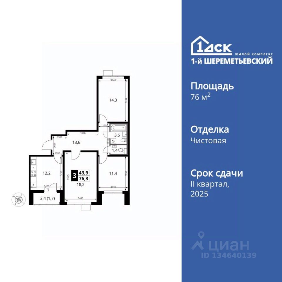 Продаётся 3-к квартира номер 32 общей площадью 76.3 кв.м. на 9-м этаже 17 этажного здания. Чистовая отделка. Цена с учётом скидки.