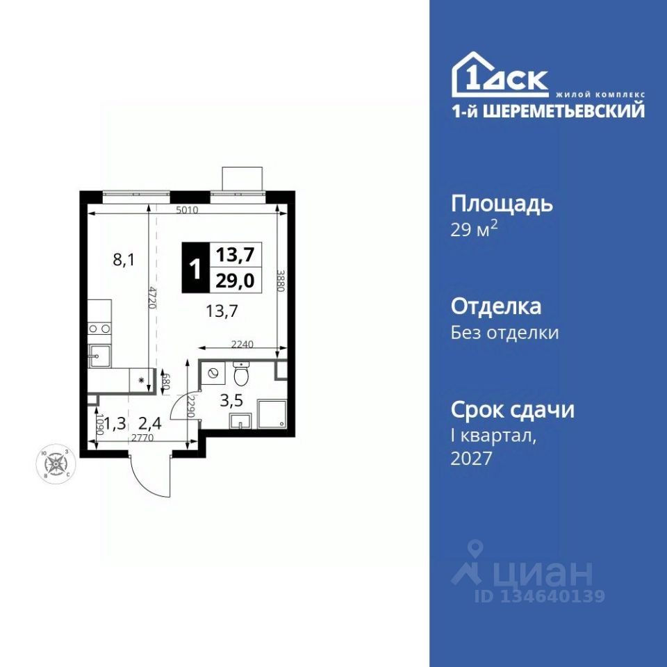 Продаётся квартира-студия номер 17 общей площадью 29 кв.м. на 4-м этаже 16 этажного дома. Без отделки.