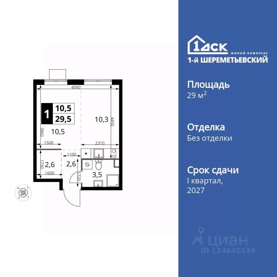 Продаётся квартира-студия номер 76 общей площадью 29.5 кв.м. на 14-м этаже 16 этажного здания. Без отделки.