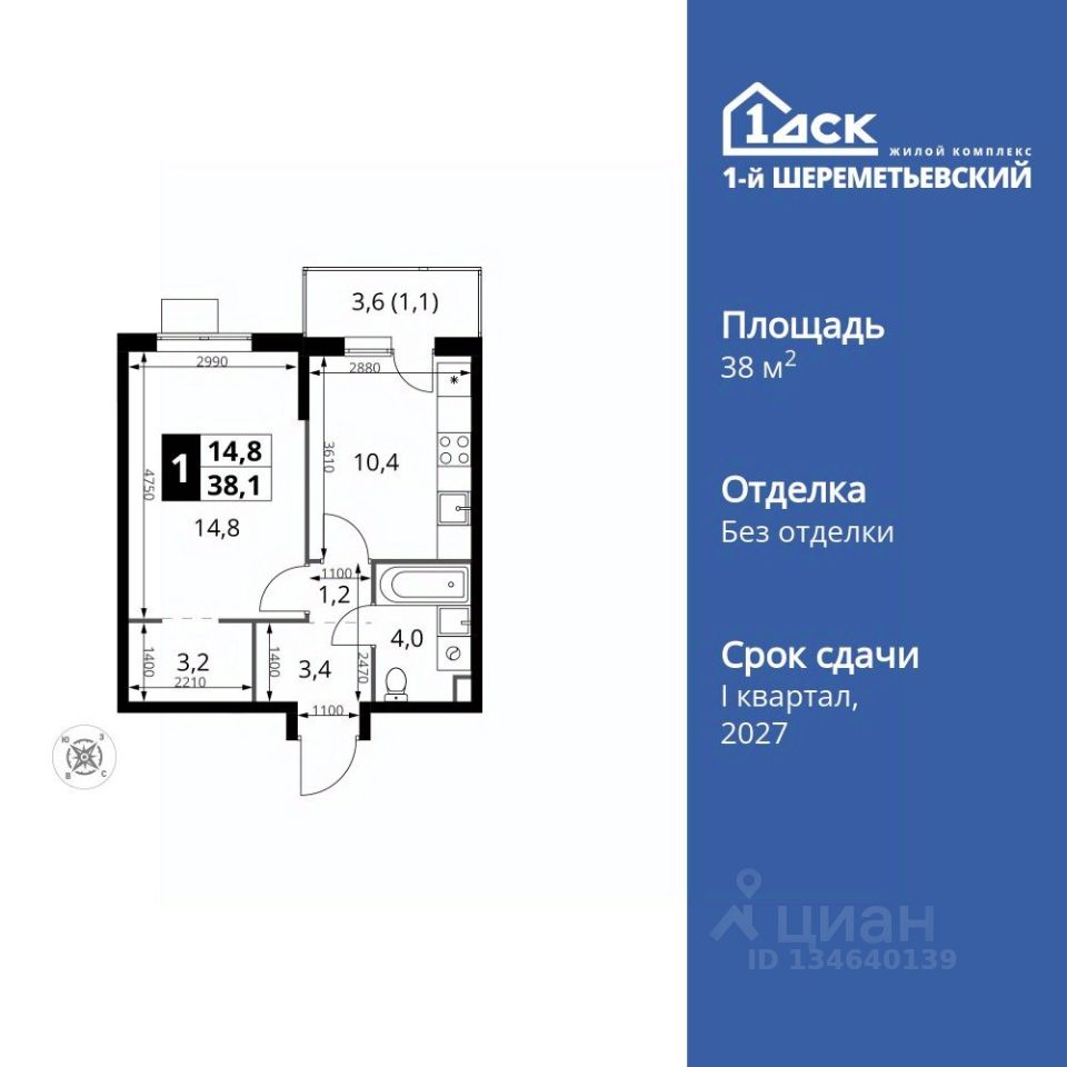 Продаётся 1-к квартира номер 821 общей площадью 38.1 кв.м. на 15-м этаже 17 этажного дома. Без отделки.
