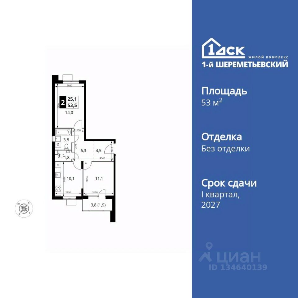 Продаётся 2-к квартира номер 892 общей площадью 53.5 кв.м. на 17-м этаже 17 этажного здания. Без отделки.