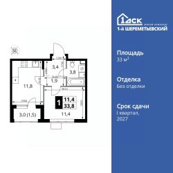 Продаётся 1-к квартира номер 898 общей площадью 33.8 кв.м. на 2-м этаже 11 этажного дома. Без отделки.