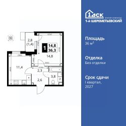 Продаётся 1-к квартира номер 942 общей площадью 36.3 кв.м. на 8-м этаже 11 этажного здания. Без отделки.
