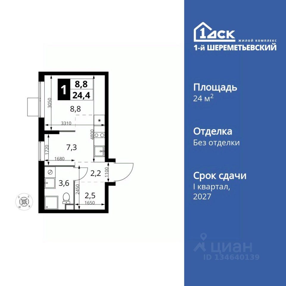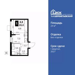 Продаётся квартира-студия номер 957 общей площадью 24.4 кв.м. на 10-м этаже 11 этажного здания. Без отделки.