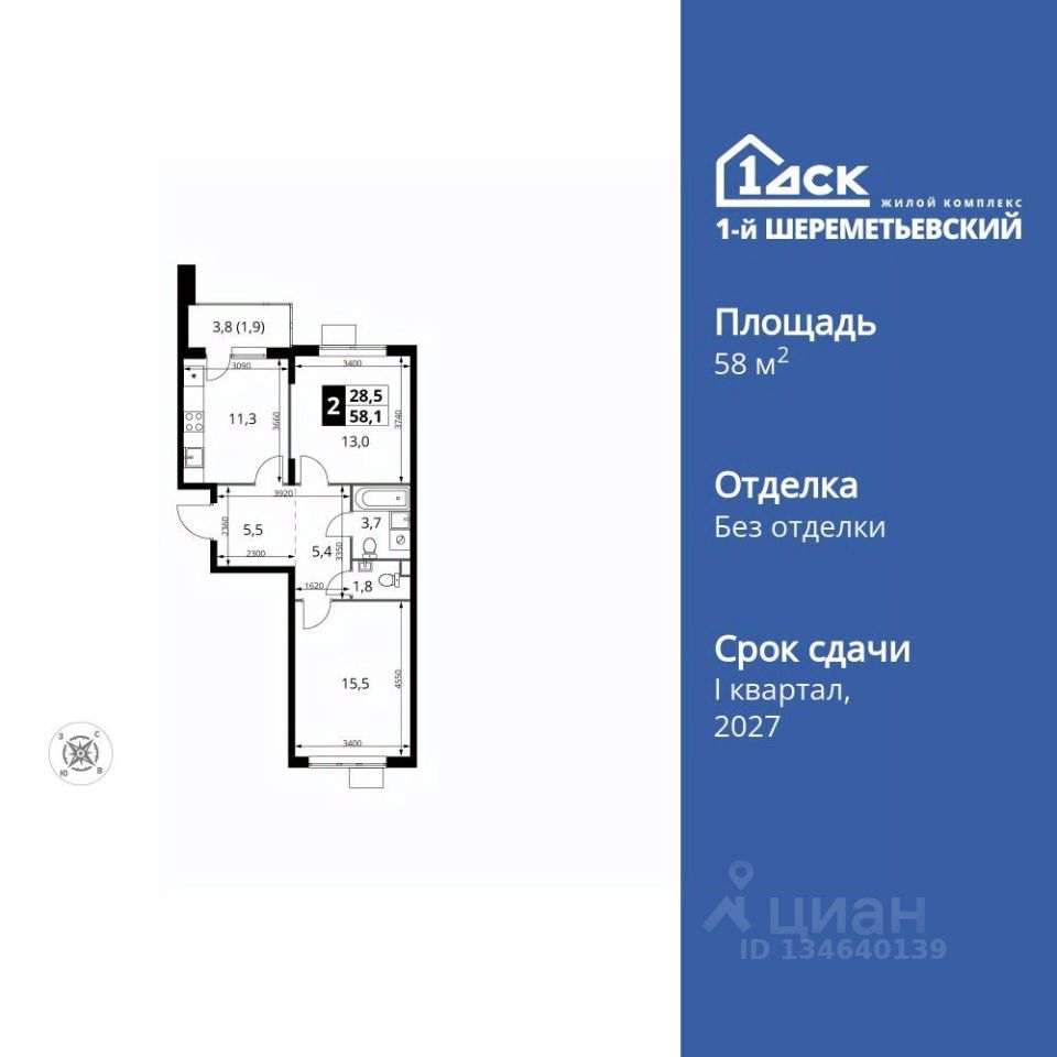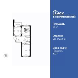 Продаётся 2-к квартира номер 974 общей площадью 58.1 кв.м. на 4-м этаже 17 этажного здания. Без отделки.