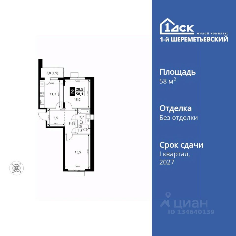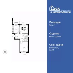 Продаётся 2-к квартира номер 1010 общей площадью 58.1 кв.м. на 13-м этаже 17 этажного дома. Без отделки.