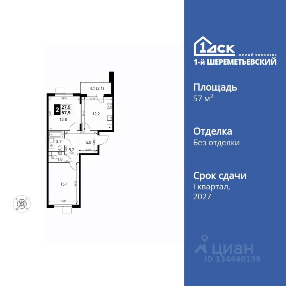 Продаётся 2-к квартира номер 997 общей площадью 57.9 кв.м. на 9-м этаже 17 этажного здания. Без отделки.