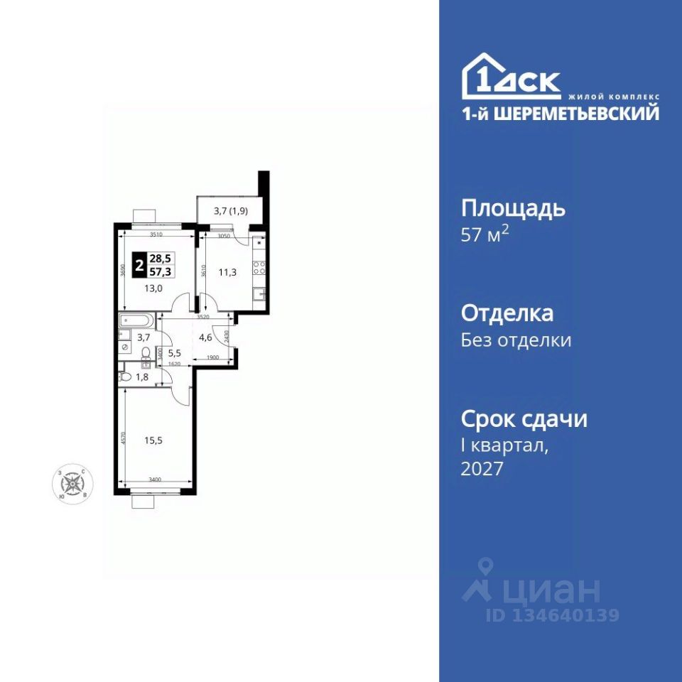 Продаётся 2-к квартира номер 1049 общей площадью 57.3 кв.м. на 5-м этаже 17 этажного дома. Без отделки.