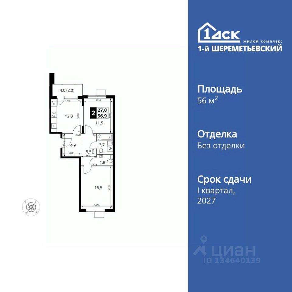 Продаётся 2-к квартира номер 1080 общей площадью 56.9 кв.м. на 12-м этаже 17 этажного дома. Без отделки.